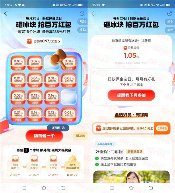 支付宝蚂蚁保金选日瓜分100万元通用红包 亲测中1.05元