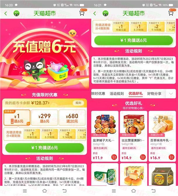 淘宝猫超卡福利 支付1元得6元天猫超市卡 分4次到账