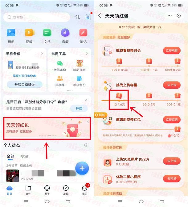1、打开中国移动云盘APP,在首页点中间滚动图【天天领红包】进去活动里(全国三网号码都可以)