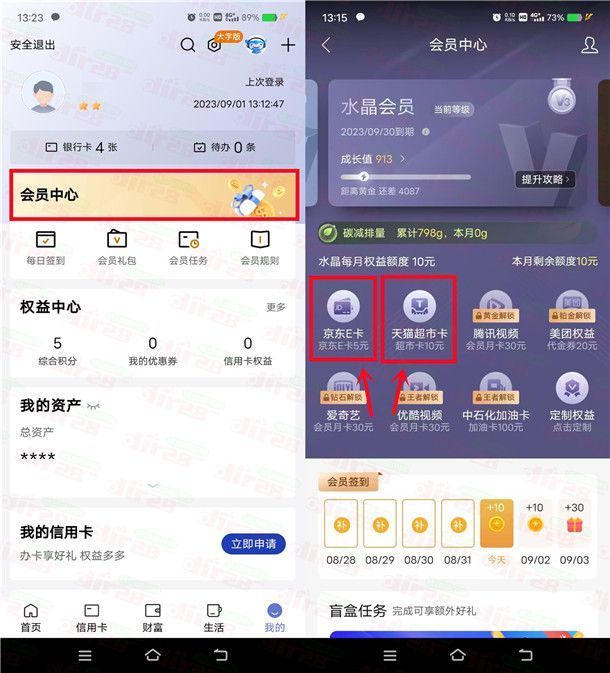 粗暴!建行会员中心简单领10元京东卡、10元天猫超市卡秒到