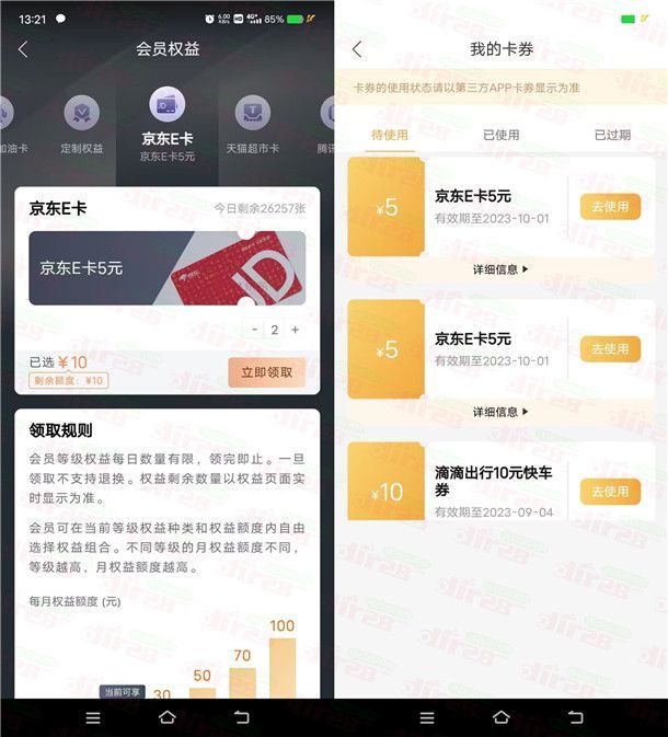 3、达到水晶会员等级后,就可以点击【京东E卡】进去免费兑换2张5元京东卡、或者兑换1张10元天猫超市卡