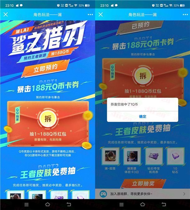 小编提示:进去预约抽1-188个Q币,以卡券的形式到账,手游上线后下载游戏领取,之前预约过的可以先取消预约再进去重新预约抽