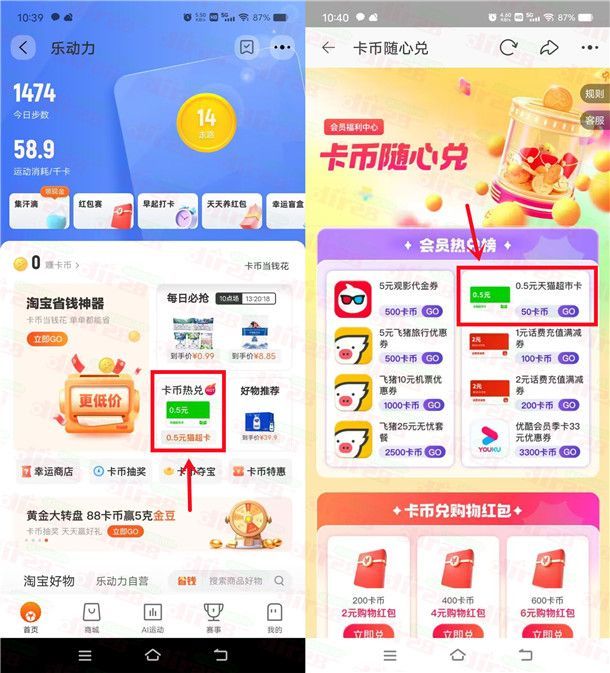 参加乐动力举办的简单步数达标兑好礼活动,通过打开淘宝APP搜索【乐动力】进去,如果是首次进去需要授权步数,然后在步数累积达到5000步会得到50卡币(每100步数=1卡币),然后就可以点“卡币热兑”进去兑换0.5元天猫超市卡。