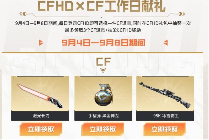 CF工作日礼包9月2023,活动期间登录CFHD即可选择一件CF道具,同时在CFHD礼包中抽奖一次,最多领取3个CF道具+抽3次CFHD奖励