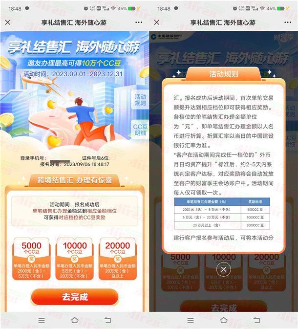 粗暴!建行奋斗季结售汇领5000-2万个CC豆 价值50元以上