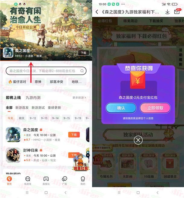 九游下载森之国度领取2-888元支付宝现金 亲测中2元秒到账