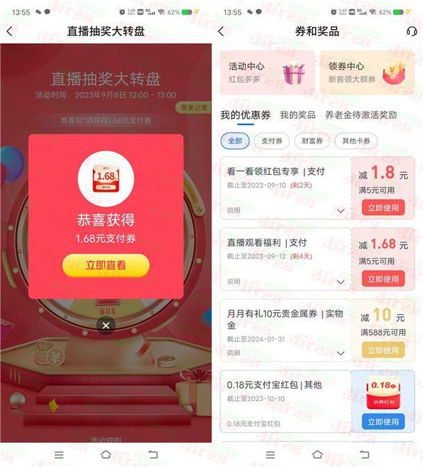 交通银行直播大转盘必中1.68-88元支付券红包 亲测中1.68元