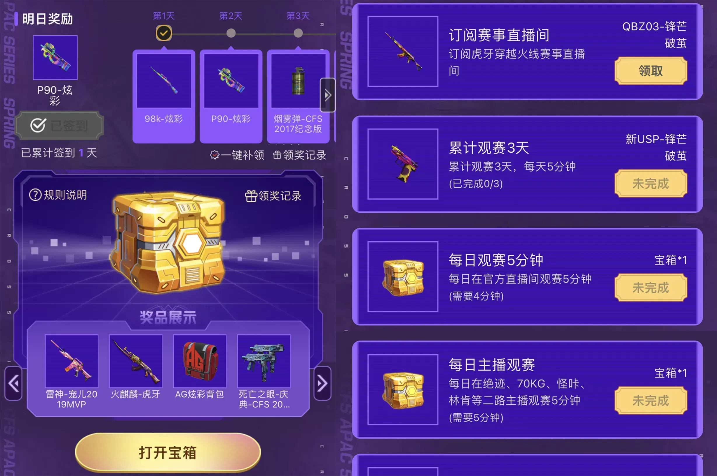 CFS亚洲系列赛 观赛领火麒麟虎牙 雷神宠儿2019MVP等,每天完成几个简单任务即可