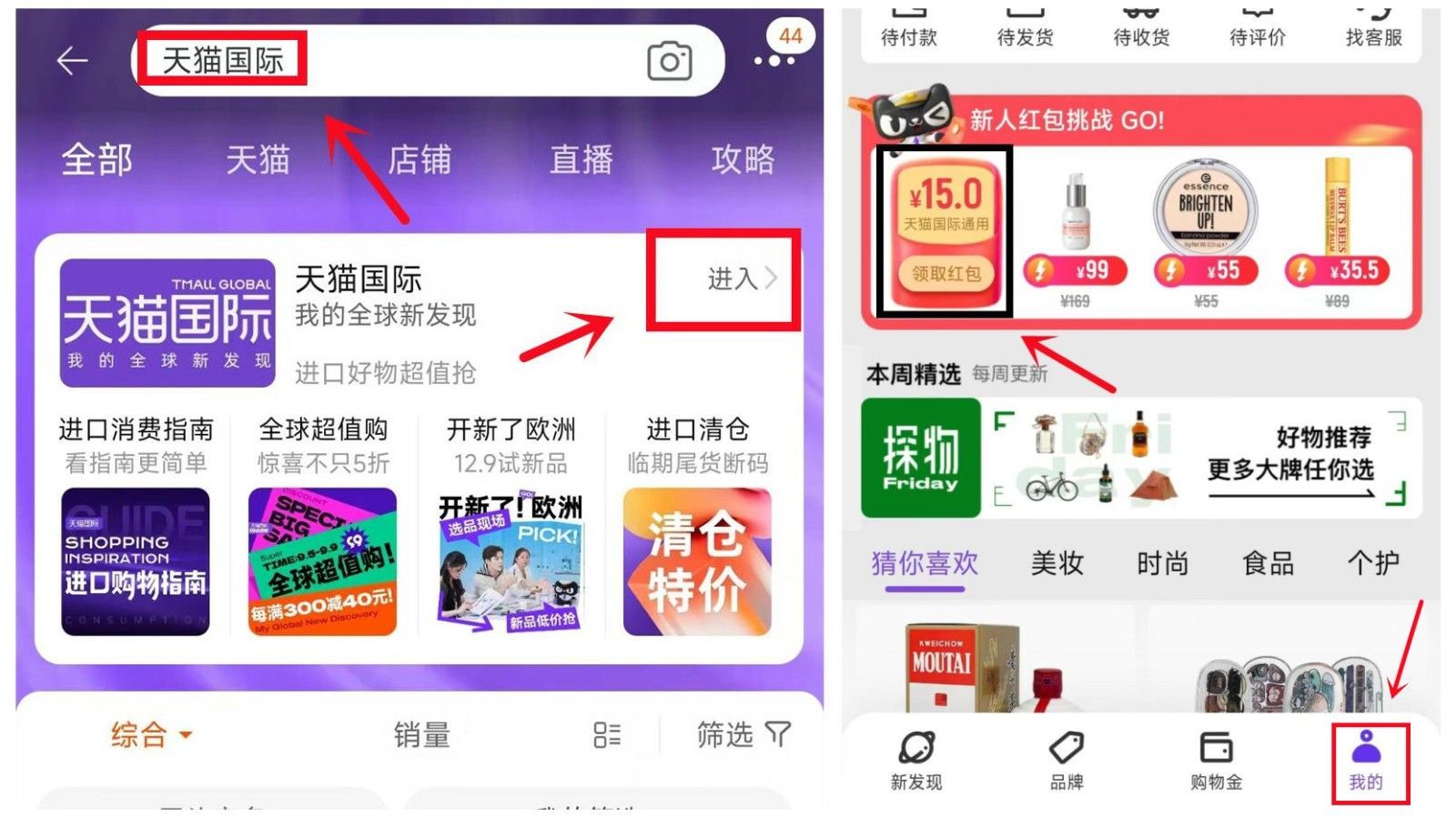 淘宝搜天猫国际,我的进去领10或15红包,这个规则是要下两笔订单才行,扫码去买1送2或者送8的都行,这个算一笔订单,然后红包自己找东西买
