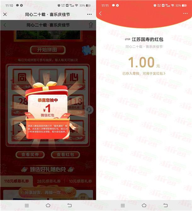 参加江苏国寿举办的同心二十载喜乐庆佳节拼图抽红包活动,通过打开微信进去活动里,完成拼图小游戏后就可以抽奖1次(每天都可以抽1次),分享1个好友助力还可以额外再抽1次,有机会中到1元微信红包,只有中到1元红包才有用,中到其他的没用,非必中。