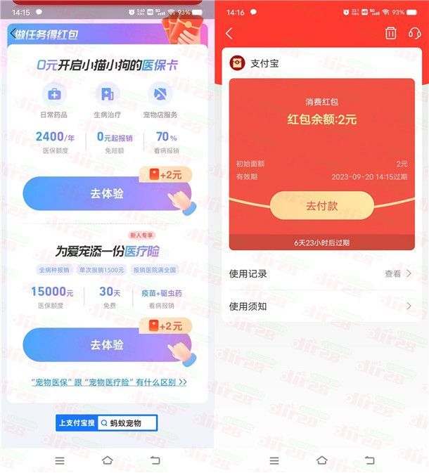 2、按照提示0元开启宠物医保卡就可以领取到2元支付宝通用红包(只要做0元领医保卡的任务就行),红包秒到支付宝卡包里,可以用支付宝APP付款的时候抵扣,也可以变现