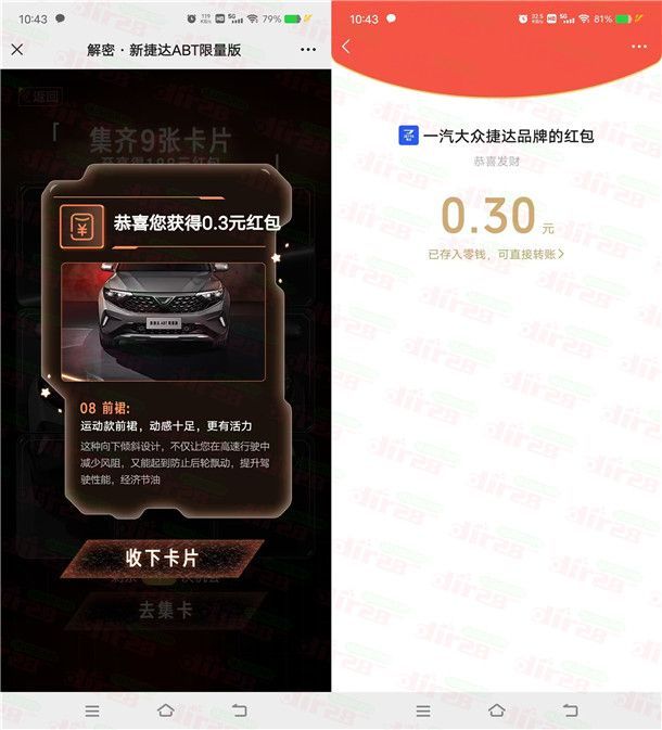 捷达和华夏基金的2个简单的活动,写在一起便于大家一起参加,通过打开微信进去活动里,捷达的活动进去默认有1次翻牌抽奖机会,有机会中到0.3-188元随机不等的微信红包,华夏基金的活动进去可以直接抽奖3次,小编测试2个活动中到0.3元+0.32元秒推,非必中。