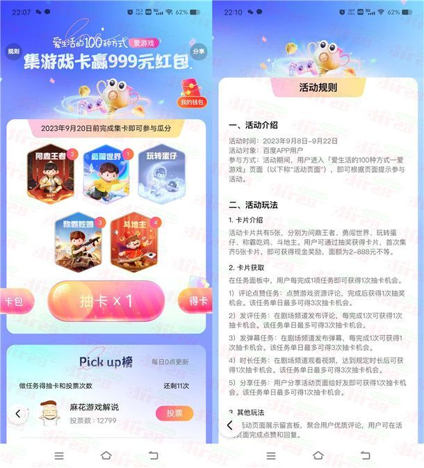 参加百度举办的爱生活的100种方式集游戏卡赢现金红包活动,通过打开百度APP进去活动里,每天都有多次抽卡机会(机会用完可以完成指定的任务抽卡),每次都会中到随机的卡片,只要集齐5张不同的卡片就可以领取到2-888元现金红包,得到的现金红包可以直接提现。