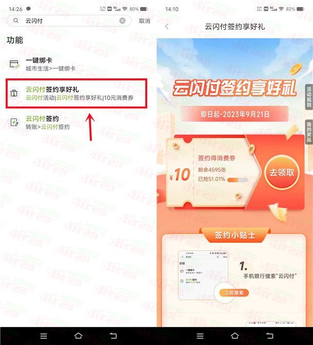 3、然后在苏州银行APP搜索【云闪付】再点【云闪付签约享好礼】进去,就可以领到10元消费券
