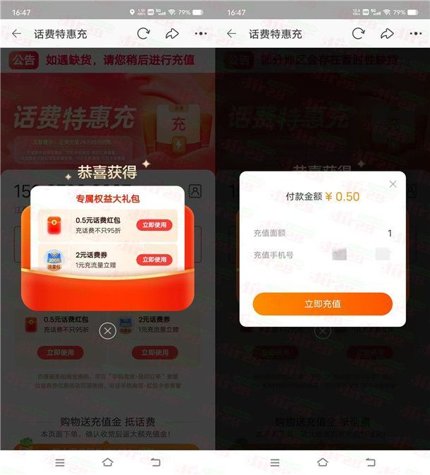 小编提示:打开淘宝APP扫码进去,机会自动弹出0.5元话费券,电信号码可以0.5充1元手机话费