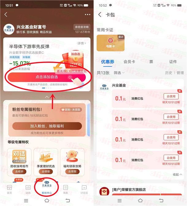 小编提示:打开支付宝APP搜索,分别搜索【兴业基金财富号】、【中银基金财富号】、【平安基金财富号】进去,点底部“粉丝中心”再左右滑动点添加自选领多个0.1元支付宝消费红包(只领消费红包就行,如果部分活动之前参加过就领不了)