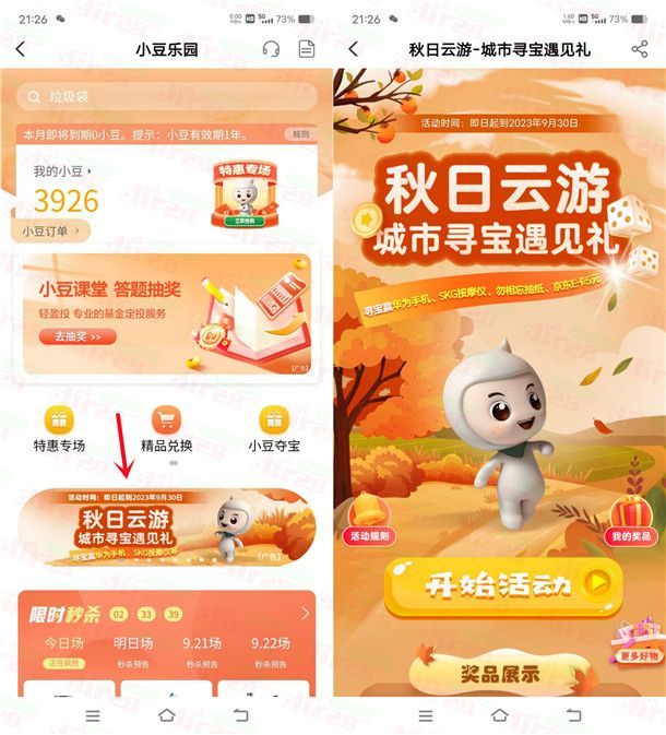 小编提示:打开中国农业银行APP,在【我的】页面点【小豆】进去,再点中间滚动图【秋日云游城市寻宝遇见礼】进去活动里,每天2次游戏机会,掷骰子走到宝箱格子就可以抽奖,非必中