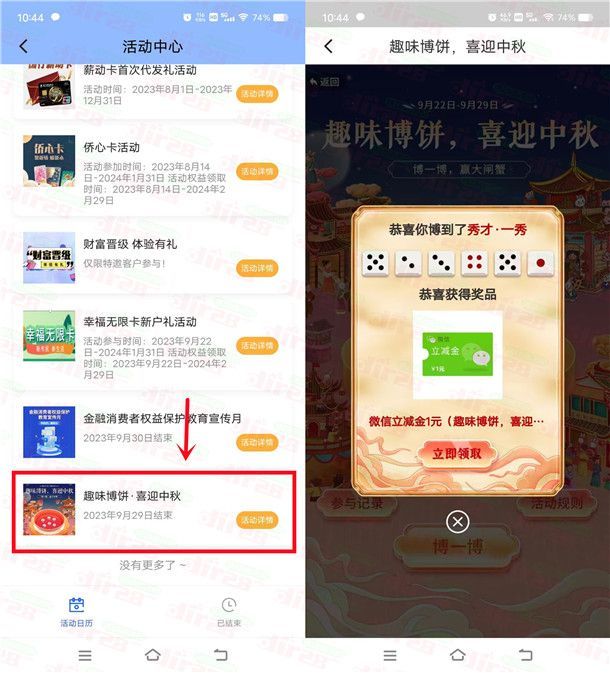 厦门国际银行中秋博饼抽1-3元微信立减金、实物 亲测中1元