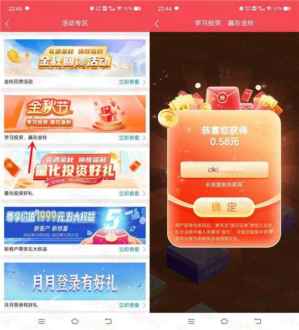 1、打开国元点金APP,首页点【活动专区】进去点【金秋节】参加