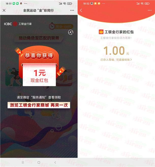 工银金行家全民运动脑动小游戏抽最高8.8元微信红包 亲测中1元