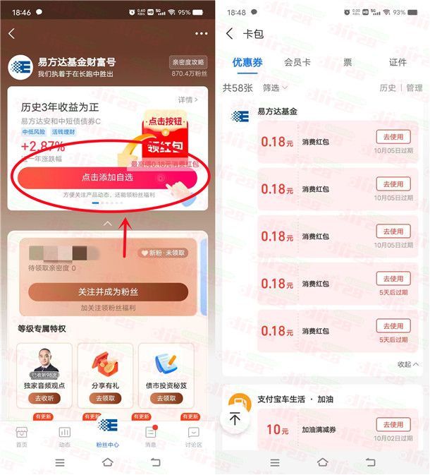 参加易方达基金财富号举办的简单一键加自选领支付宝消费红包活动,以往支付宝也有过多次类似的活动,通过打开支付宝APP搜索【易方达基金财富号】进去粉丝中心页面,左右滑动页面一键添加多个自选可以领到多个0.18元支付宝通用消费红包,领到的红包秒到支付宝卡包里,可以在支付宝APP付款的时候抵扣使用,也可以变现。