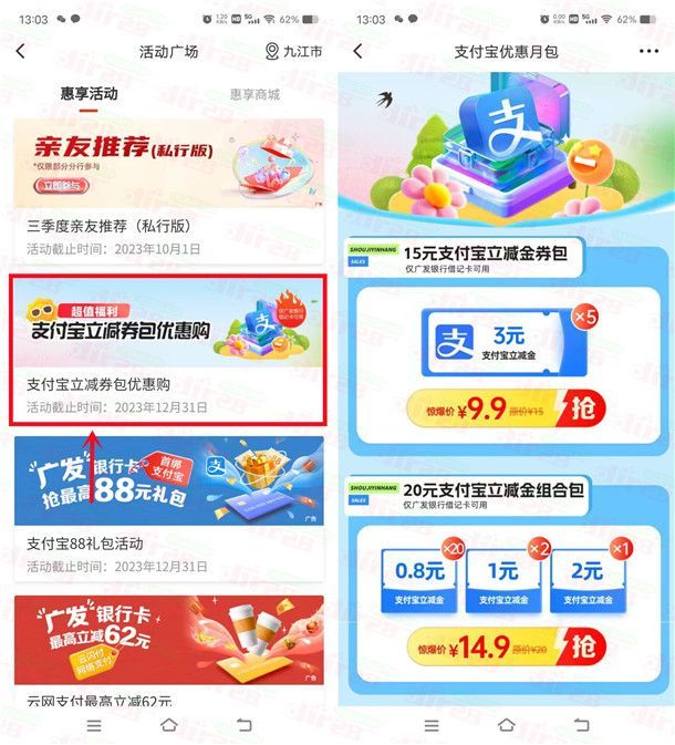 小编提示:打开广发银行APP,首页点“活动广场”进去,下拉页面找到“支付宝立减券包优惠购”进去,支付9.9元可以购买5张3元支付宝立减金,支付14.9元可以购买20元支付立减金组合包,购买到立减金后,按照提示领取到支付宝,在支付宝支付的时候选择广发银行卡就可以抵扣(二类电子卡也可以),数量限量