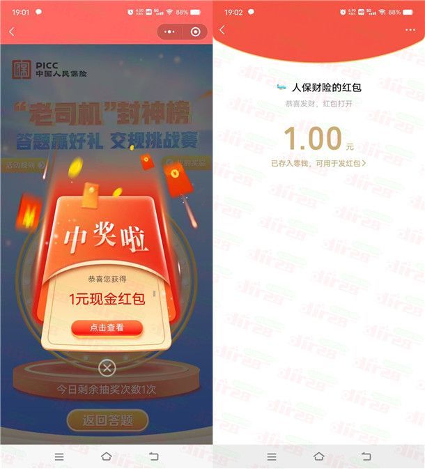 参加中国人保财险举办的喜迎国庆金秋有礼交规挑战赛活动,通过打开微信进去活动里,每天进去默认有2次答题机会,完成指定的浏览任务可以增加答题次数,5道题全部答对可进行抽奖,有机会中到1元微信红包、或者实物,抽1元微信红包、到红包需要手动领取,非必中。