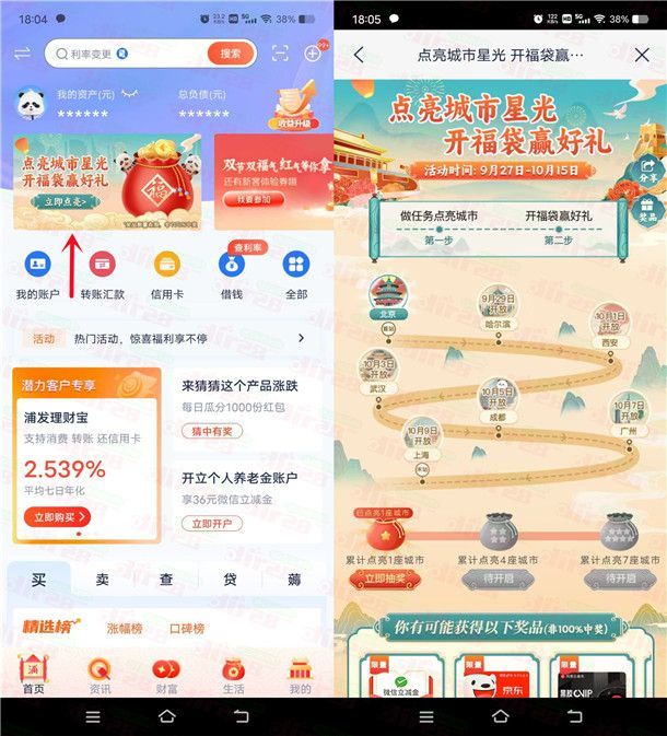 小编提示:打开浦发银行APP,首页点图片【点亮城市星光开福袋赢好礼】进去,在规定日期当天可以点亮城市,累积点亮1座城市、4座城市、7座城市可以分别开福袋抽奖1次,非必中