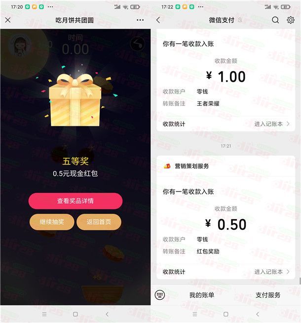 参加科学辟谣举办的吃月饼共团圆小游戏抽红包活动,通过打开微信进去活动里,用手指控制篮子移动接下月饼,小游戏分数达到80分可以进行抽奖,有机会中到0.5-5元微信红包,每个微信每天可以抽奖3次,小编测试中到0.5元,非必中。