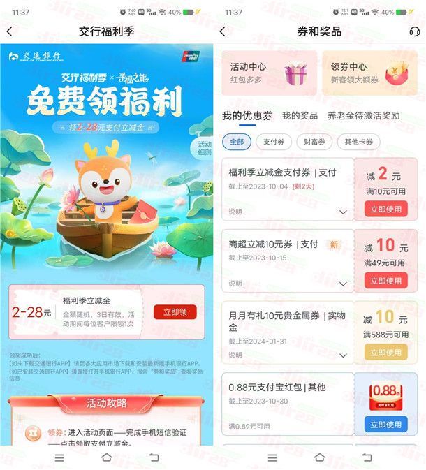 交通银行福利季活动必中2-28元支付券红包 亲测中2元