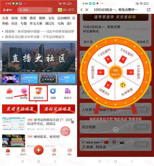 小编提示:下载打开“爱嵊州”APP,首页点“阅读有礼”进去,浏览6篇文章可以抽1次红包,可以中多次,刚中2个0.5元微信红包,非必中