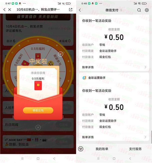参加爱嵊州举办的佳节赏佳作看新闻抽红包活动,通过下载打开爱嵊州APP进去活动里,进去浏览6篇文章可以抽奖1次,可以抽多次,有机会中到0.5-88元微信红包,这个活动也可以中多次,小编测试中到2个0.5元,非必中。
