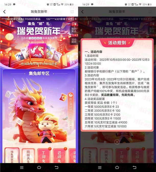 邮储银行集兔邮礼抽5-10元支付宝立减金、100-5000元京东卡