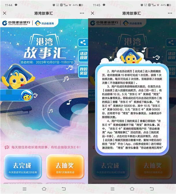 建行劳动者港湾五周年故事汇抽5-10元京东卡 每天3次机会
