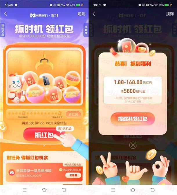 小编提示:开支付宝APP搜索“网商银行双11”或者支付宝APP扫码进去,简单得次数抓一下,完成累积抓次数可以在11月11日回到活动里抽奖2次,可以抽1.88-168.88元现金红包,数量限量