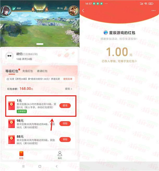 2、打开山海经幻想录红包版app,登录后按照游戏引导玩到10级就行(大概8-10分钟就可以到10级),然后就可以领取到1元微信红包,领到的红包目前秒推,只领这个新手1元红包就行,其他的红包都没用,数量限量