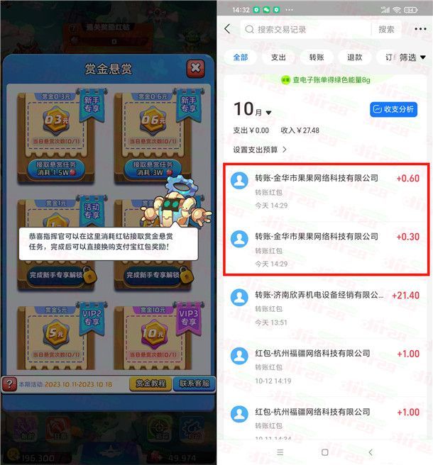 3、按照游戏引导玩3分钟,就可以点击右侧图标兑换0.3元+0.6元支付宝现金,秒到