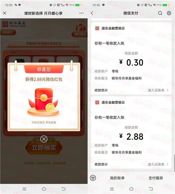 参加银华基金举办的撕日历小游戏抽红包活动,通过打开微信进去活动里,在30秒小游戏中撕日历满30张即可挑战成功,有机会中到1.88-5.88元微信红包,在撕的过程中也有概率中到小额微信红包,小编测试中到0.3元+2.88元秒推,非必中。