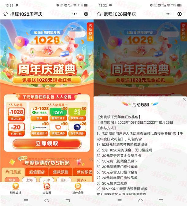 参加携程举办的1028周年庆盛典领最高1028元现金红包活动,通过打开微信进去小程序活动里,进去分享3个好友或者小号助力,就可以必得2-1028元现金红包,得到的现金红包可以直接提现到银行卡,如果中到其他视频月卡就更划算了,最低的奖项也是2元现金。