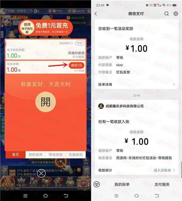 仙道轮回红包版这个游戏是西游网的一个游戏,所有安卓手机都可以去,通过下载打开仙道轮回红包版app游戏,注册登录后完成防沉迷实名,然后跟着主线任务玩3分钟到达50级就可以提现1元到微信,提现后目前秒推送,数量限量。