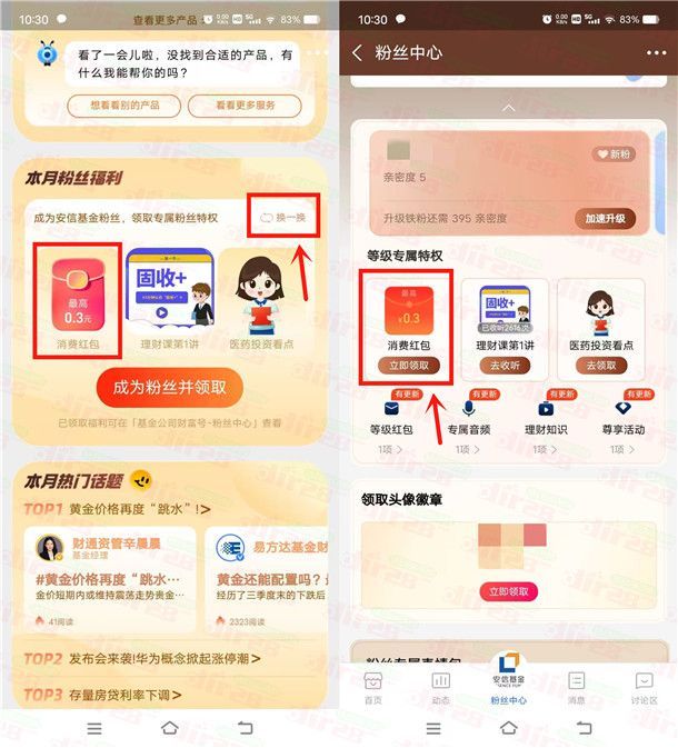 1、打开支付宝APP搜索【18财富日】进去,进去后下拉页面在本月粉丝福利那里点击右侧的【换一换】找有消费红包的任务就行