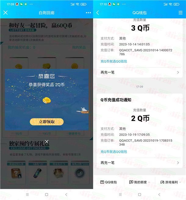 白荆回廊手机QQ预约抽1-60个Q币 亲测中2个Q币秒到