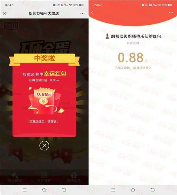 小编提示:需要先关注公众号【厨邦顶级厨师俱乐部】才可以参加,进去可以直接砸蛋抽2次红包,之后每消耗30积分还可以额外抽1次(最多消耗积分额外抽2次),刚中0.88元,非必中
