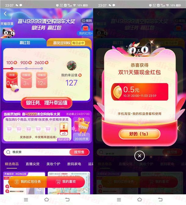 淘宝预售会场领幸运值得0.5-15.5元淘宝无门槛红包 亲测秒到