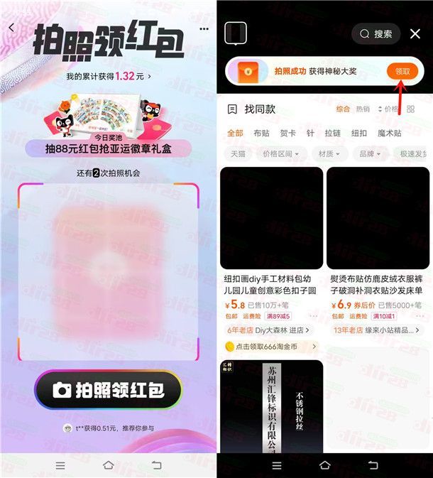 立即参与:打开淘宝APP搜索【拍照领红包】进去参加