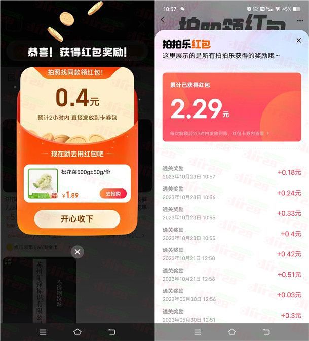 淘宝拍照领红包每天领多个淘宝无门槛红包 累积中2.29元