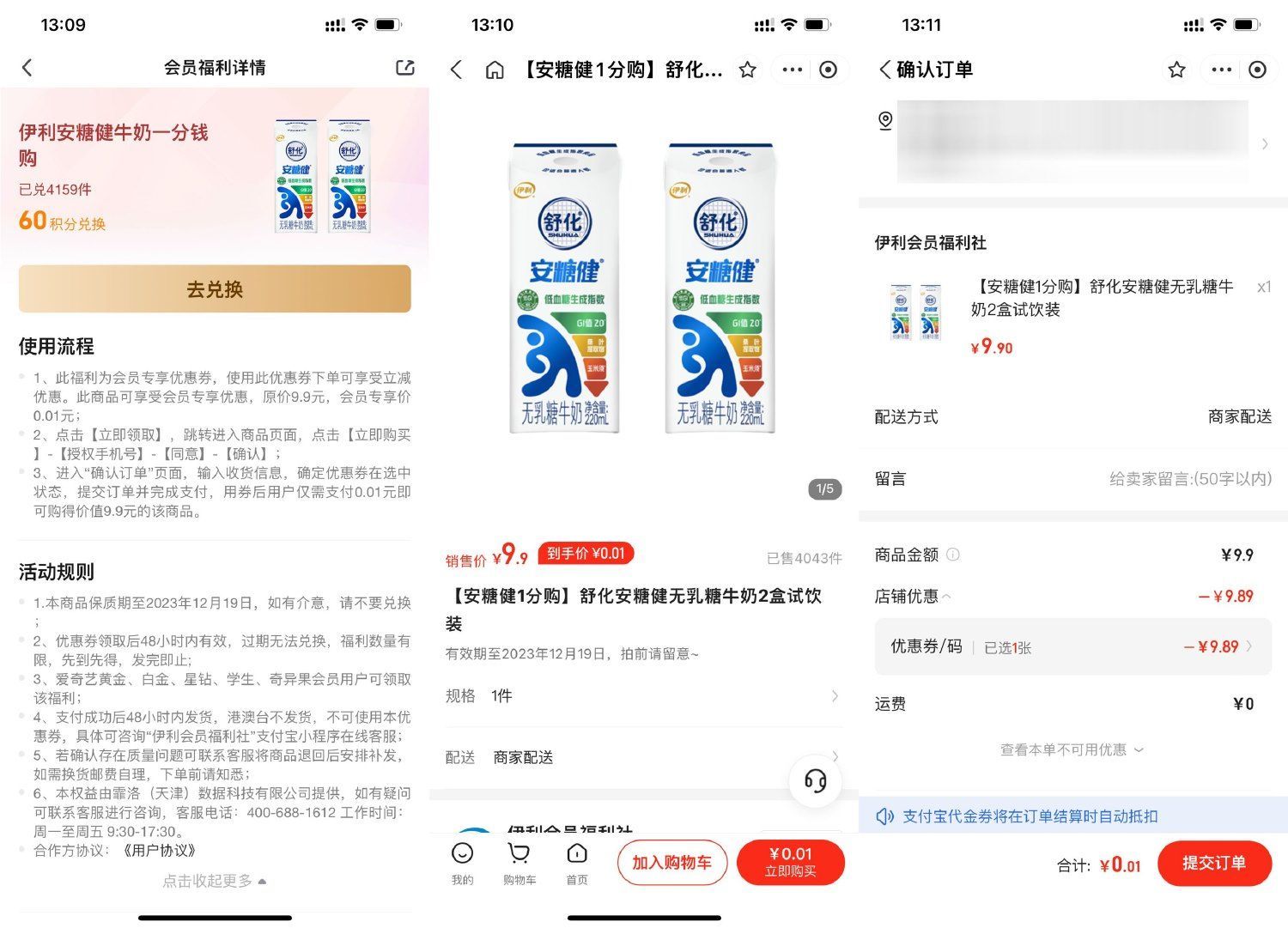 爱奇艺APP扫码->使用60积分兑换->直接0.01元撸2瓶伊利牛奶包邮