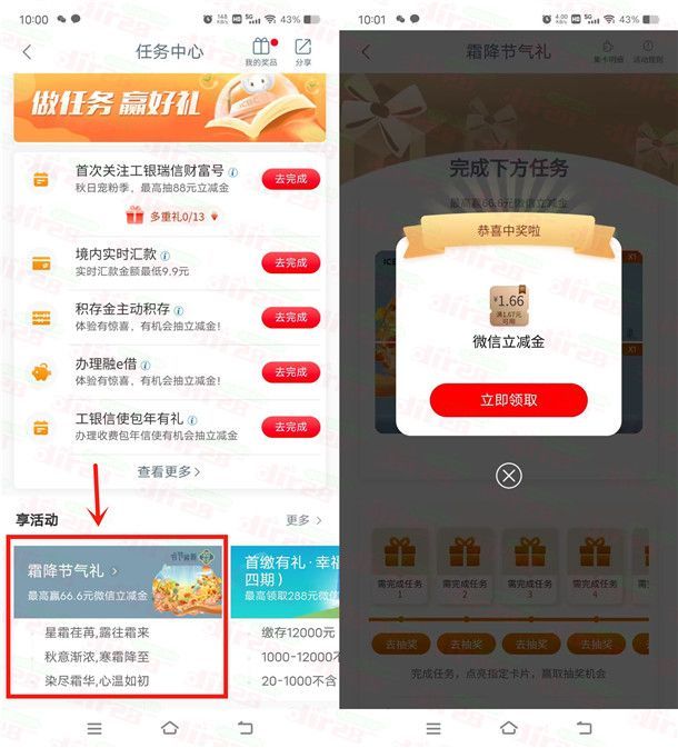 小编提示:打开中国工商银行APP搜索【任务中心】进去,在享活动下面点击【霜降节气礼】进去,完成4个简单的浏览任务可以抽奖5次,刚中1.66元,可以中多次,非必中