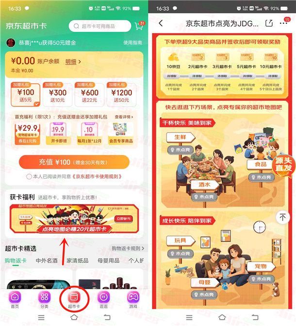 小编提示:打开京东APP首页点【京东超市】进去,再点底部【超市卡】点横幅图片【点亮地图必赚20元超市卡】进去报名参加,双11期间经常会有低价的实物,到时候买了啥品类的就点亮啥,点亮5个可以共得20元京东超市卡