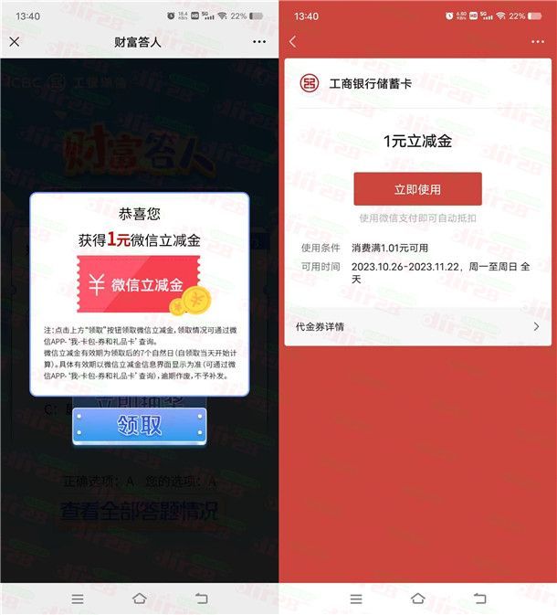 小编提示:3题全部答对抽1-188元微信立减金,如果答错了可以重新答,每个微信每周只能抽1次,中到的微信立减金全国地区的工商银行卡都可以抵扣,也可以变现,非必中